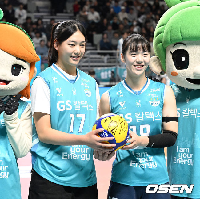 경기에 앞서 경해여중 손서연이 시구를 마치고 롤모델 유서연과 기념촬영을 하고 있다. 2025.12.05 /sunday@osen.co.kr