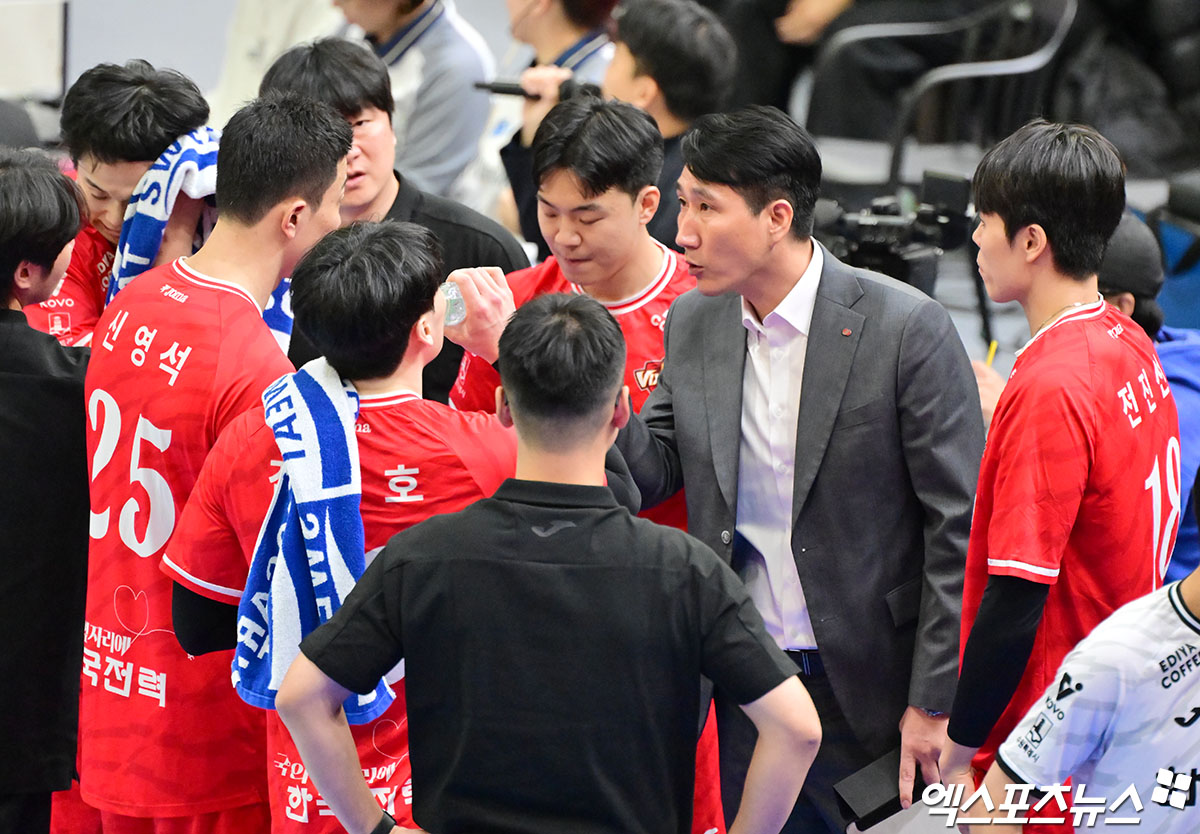 (엑스포츠뉴스 수원, 김한준 기자) 5일 오후 경기도 수원실내체육관에서 열린 '진에어 2025-2026 V-리그' 한국전력과 OK저축은행의 경기, 한국전력 권영민 감독이 작전을 지시하고 있다.
