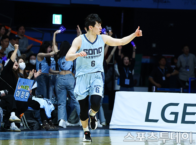 [스포츠투데이 팽현준 기자] 5일 경기도 고양소노아레나에서 열린 2025-2026 프로농구 고양 소노와 서울 SK의 경기, 소노 이정현이 골을 넣고 있다. 2025.12.05.