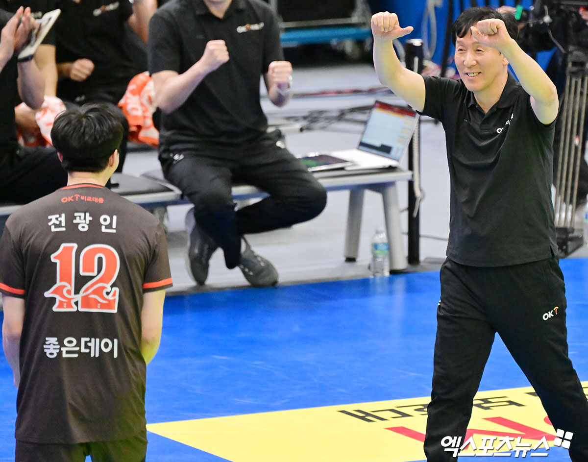 (엑스포츠뉴스 수원, 김한준 기자) 5일 오후 경기도 수원실내체육관에서 열린 '진에어 2025-2026 V-리그' 한국전력과 OK저축은행의 경기, OK저축은행 신영철 감독이 기뻐하고 있다.