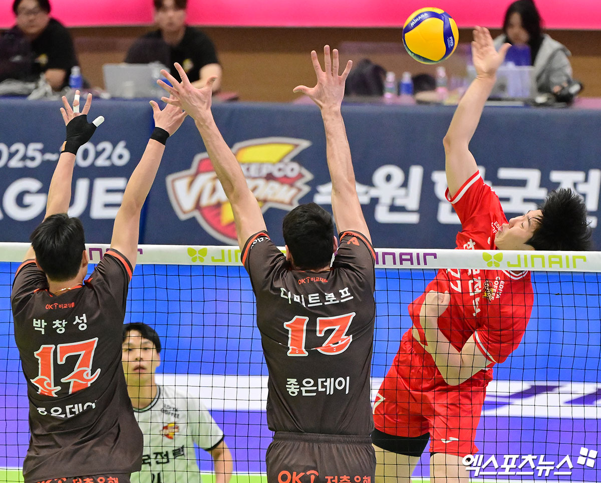 (엑스포츠뉴스 수원, 김한준 기자) 5일 오후 경기도 수원실내체육관에서 열린 '진에어 2025-2026 V-리그' 한국전력과 OK저축은행의 경기, 한국전력 윤하준이 공격을 시도하고 있다.