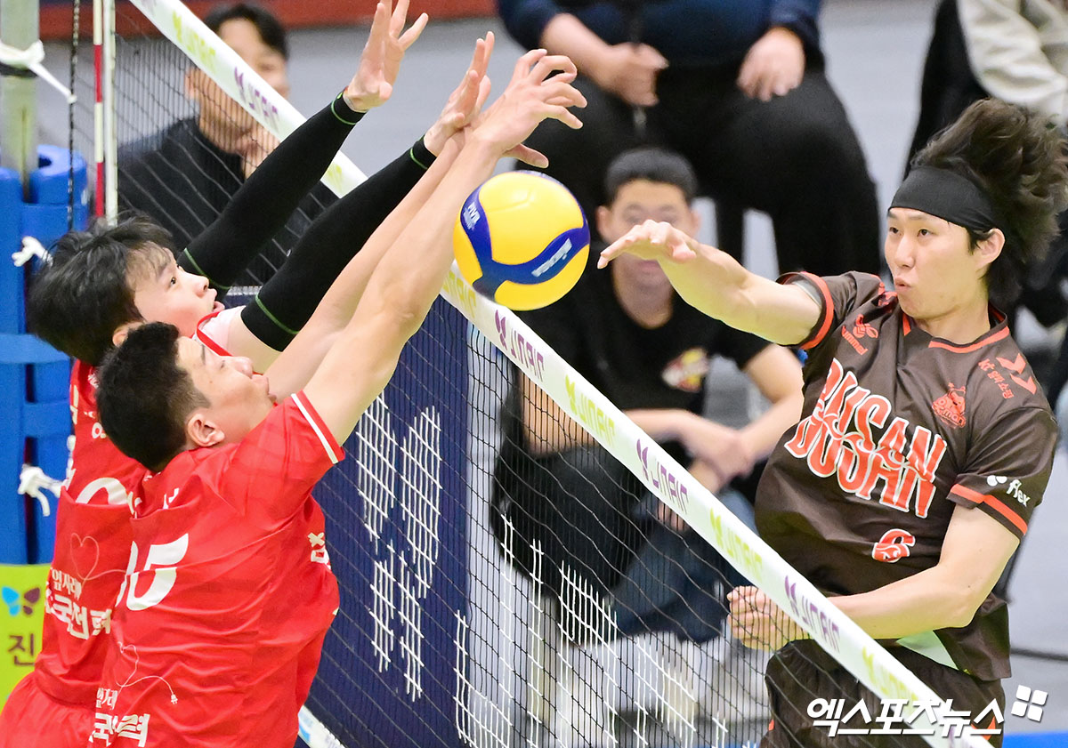 (엑스포츠뉴스 수원, 김한준 기자) 5일 오후 경기도 수원실내체육관에서 열린 '진에어 2025-2026 V-리그' 한국전력과 OK저축은행의 경기, OK저축은행 이민규가 공격을 시도하고 있다.