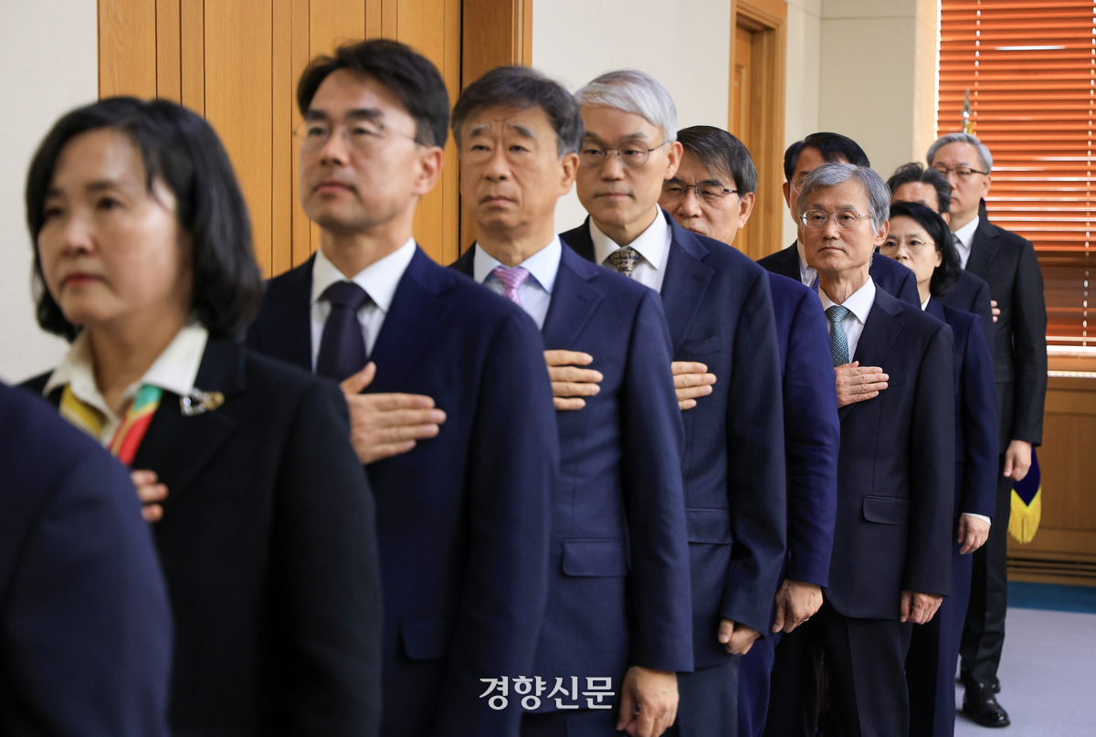 조희대 대법원장과 전국 법원장들이 5일 오후 서울 서초구 대법원 대회의실에서 열린 전국법원장회의에서 국기에 대한 경례를 하고 있다. 이준헌 기자 |
