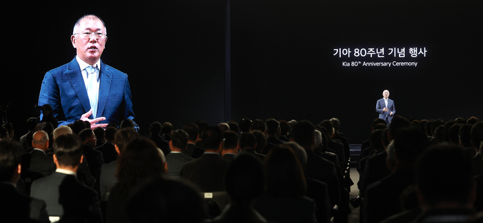 정의선 현대차그룹 회장이 5일 경기 용인시 기아 비전스퀘어에서 열린 기아 80주년 기념식에서 발언하고 있다. [연합뉴스] |