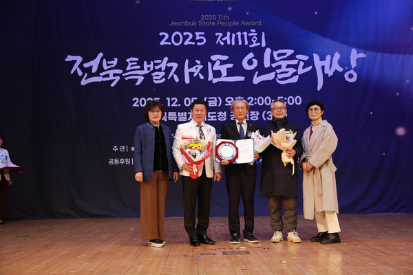 최창수 ‘고산마음여행학교’ 교장이 5일 전북도청에서 치러진 전북특별자치도 인물대상 시상식 "교육,인성지도 부문"에서 대상을 수상하고 기념촬영을 하고있다.(사진=박호정 기자)