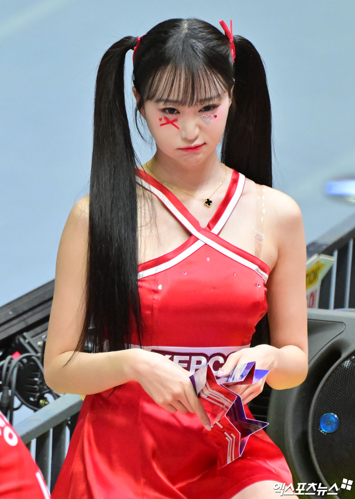 (엑스포츠뉴스 수원, 김한준 기자) 5일 오후 경기도 수원실내체육관에서 열린 '진에어 2025-2026 V-리그' 한국전력과 OK저축은행의 경기, 정가예 치어리더가 열띤 응원을 선보이고 있다.