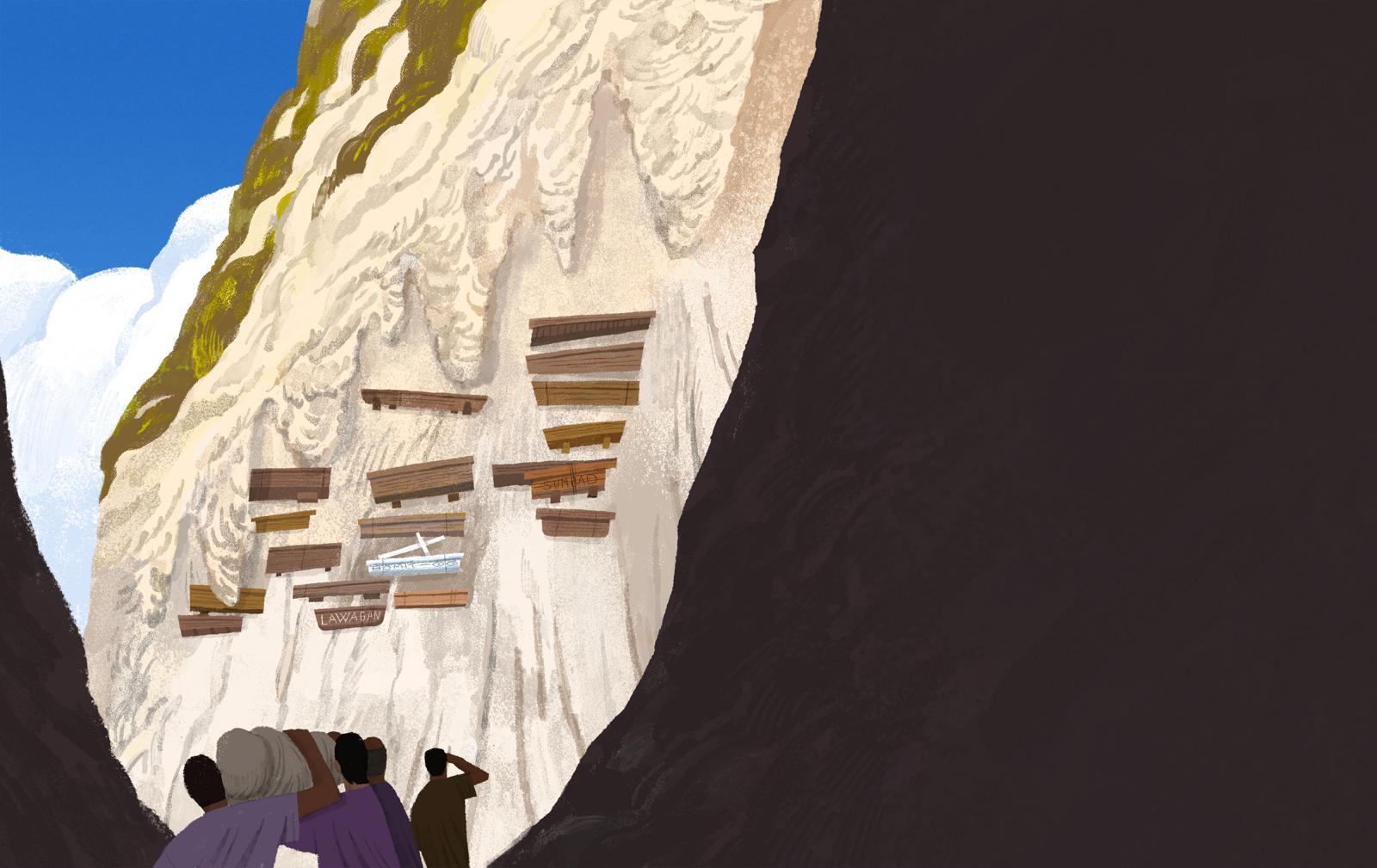 멕시코의 ‘죽은 자의 날’ 축제부터 한국의 차례상 문화까지, 세계 각국은 저마다의 장례 풍습을 통해 죽은 이를 산 자의 기억 속에 기려 왔다. 사진은 필리핀의 ‘절벽에 매달려 있는 관’을 나타낸 일러스트. 시그마북스 제공 |