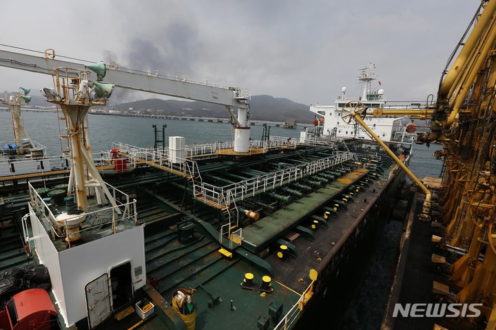 [푸에르토 카벨로=AP/뉴시스] 베네수엘라 푸에르토 카벨로에 있는 엘팔리토 정유공장 부두에 대형 유조선이 접안하고 있다. 자료사진. 2025.12.05 |