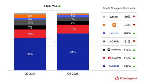 보고서는 "3분기 글로벌 폴더블 스마트폰 출하량은 전년 동기 대비 14% 증가하며 역대 최대 분기 실적을 기록했으며 삼성 갤럭시 Z 폴드7 시리즈가 가장 큰 성장 동력이 됐다"고 분석했다.