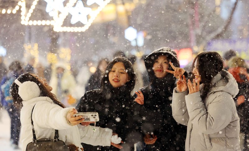 지난 4일 서울 마포구 홍대 부근에 눈이 내리는 가운데 외국인 관광객들이 기념사진을 촬영하고 있다. 연합뉴스 |