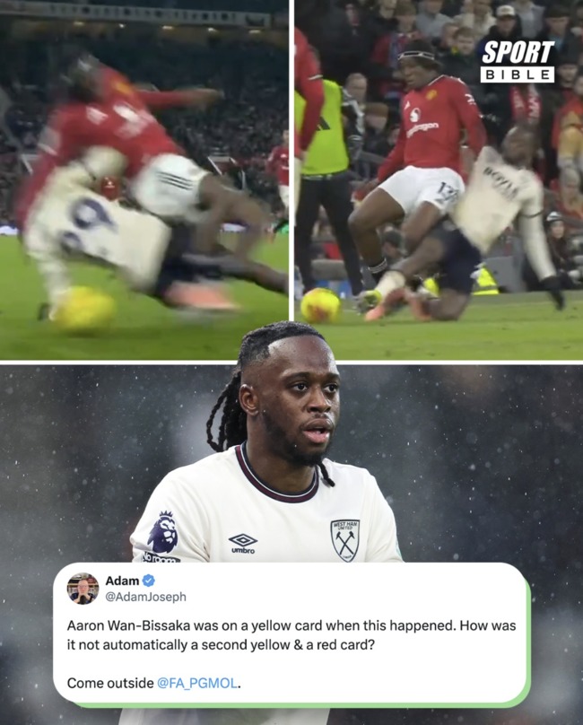 영국 '스포츠 바이블'은 5일 "완-비사카가 도르구에게 가한 태클 이후 두 번째 옐로 카드를 받지 않았다. 그냥 넘어간 것에 대해 맨유 팬들은 의문을 제기하고 있다"라고 전했다.