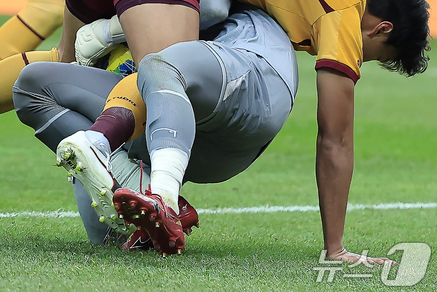 (서울=뉴스1) 박정호 기자 = 6일 오후 서울 마포구 월드컵로 서울월드컵경기장에서 열린 광주FC와 전북현대의 2025 하나은행 코리아컵 결승전에서 광주 김경민 골키퍼가 같은팀 조성권과 충돌하며 눌려 오른쪽 발목이 돌아가고 있다. 이 충돌로 김경민 골키퍼는 교체됐다. 2025.12.6/뉴스1