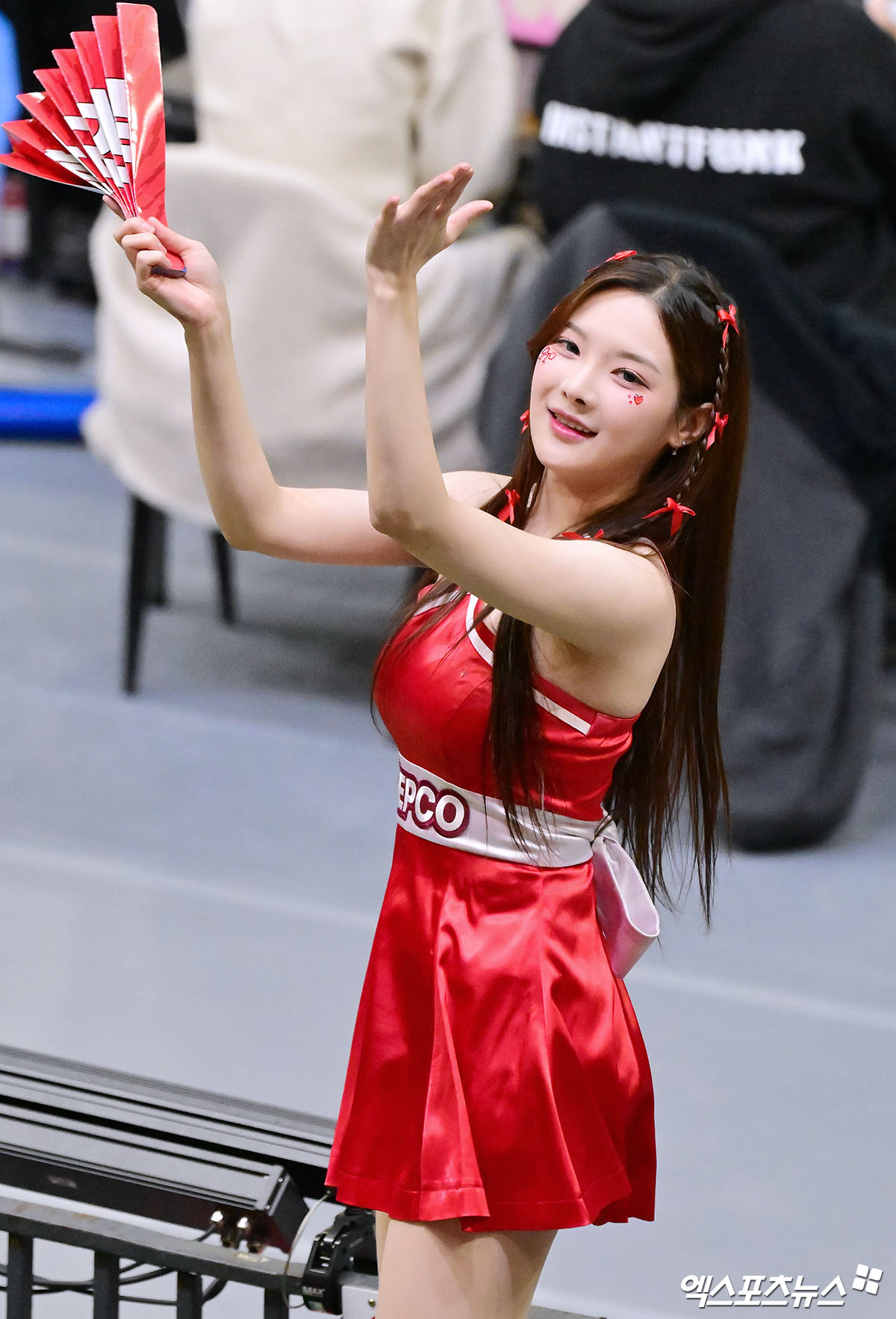 (엑스포츠뉴스 수원, 김한준 기자) 5일 오후 경기도 수원실내체육관에서 열린 '진에어 2025-2026 V-리그' 한국전력과 OK저축은행의 경기, 이은혜 치어리더가 열띤 응원을 선보이고 있다.