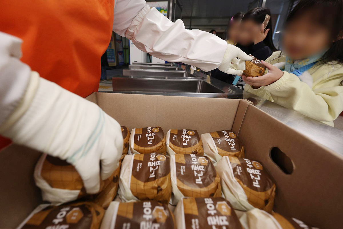 전국학교비정규직연대회의가 파업에 들어간 5일 대구의 한 초등학교 급식실에서 학생들이 대체식으로 제공된 햄버거를 받고 있다. 뉴스1 |