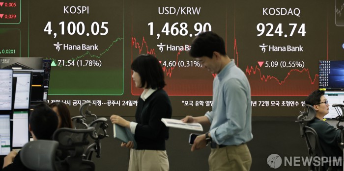 [서울=뉴스핌] 양윤모 기자 = 5일 오후 코스피가 전장 종가보다 71.54 포인트(1.78%) 상승하며 4100.05로, 코스닥은 5.09 포인트(0.55%) 하락한 924.74로 장을 마감한 가운데, 서울 중구 하나은행 딜링룸에서 직원들이 업무를 보고 있다. 서울외환시장에서 달러/원 환율은 전장 대비 4.60원 하락한 1468.90원에 주간거래를 마감했다. 2025.12.05 yym58@newspim.com |
