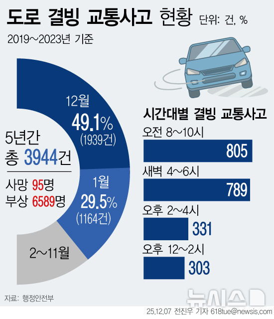 [서울=뉴시스] 7일 행정안전부에 따르면 지난 2019년부터 2023년까지 5년간 도로 결빙으로 인한 교통사고는 총 3944건 발생했다. 이로 인한 사망자는 95명, 부상자는 6589명으로 집계됐다. 눈·비가 내린 후에 터널 출입구나 교량 위에서는 도로 표면에 얇은 얼음막이 형성되기 쉬워, 운전할 때 속도를 줄이고 앞차와의 안전 거리를 충분히 확보하는 등 각별한 주의가 필요하다. (그래픽=전진우 기자)