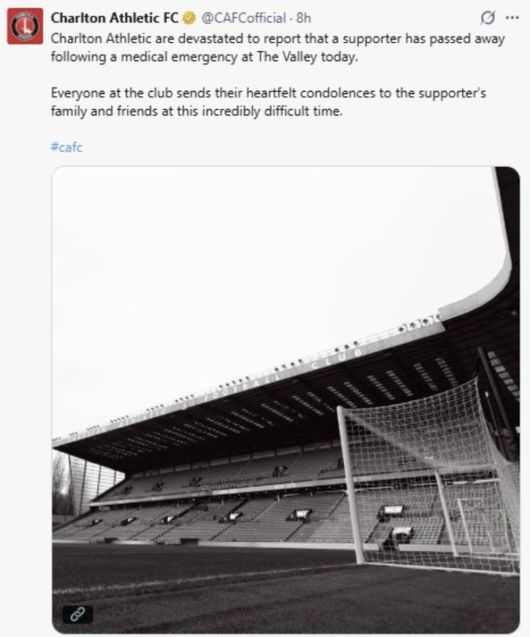 비극의 소식은 곧 공식화됐다. 찰튼 구단은 성명을 통해 “오늘 더밸리에서 열린 포츠머스와 경기에서 서포터 1명이 응급 의료 상황으로 사망했다는 소식을 전하게 돼 깊은 슬픔에 잠겼다”고 전했다. 이어 포츠머스도 “오늘 경기에서 찰턴 서포터가 세상을 떠났다는 소식에 큰 슬픔을 느낀다”라며 “어려운 시기를 겪고 있을 유가족과 친구들에게 깊은 애도를 표한다”고 위로의 뜻을 밝혔다.