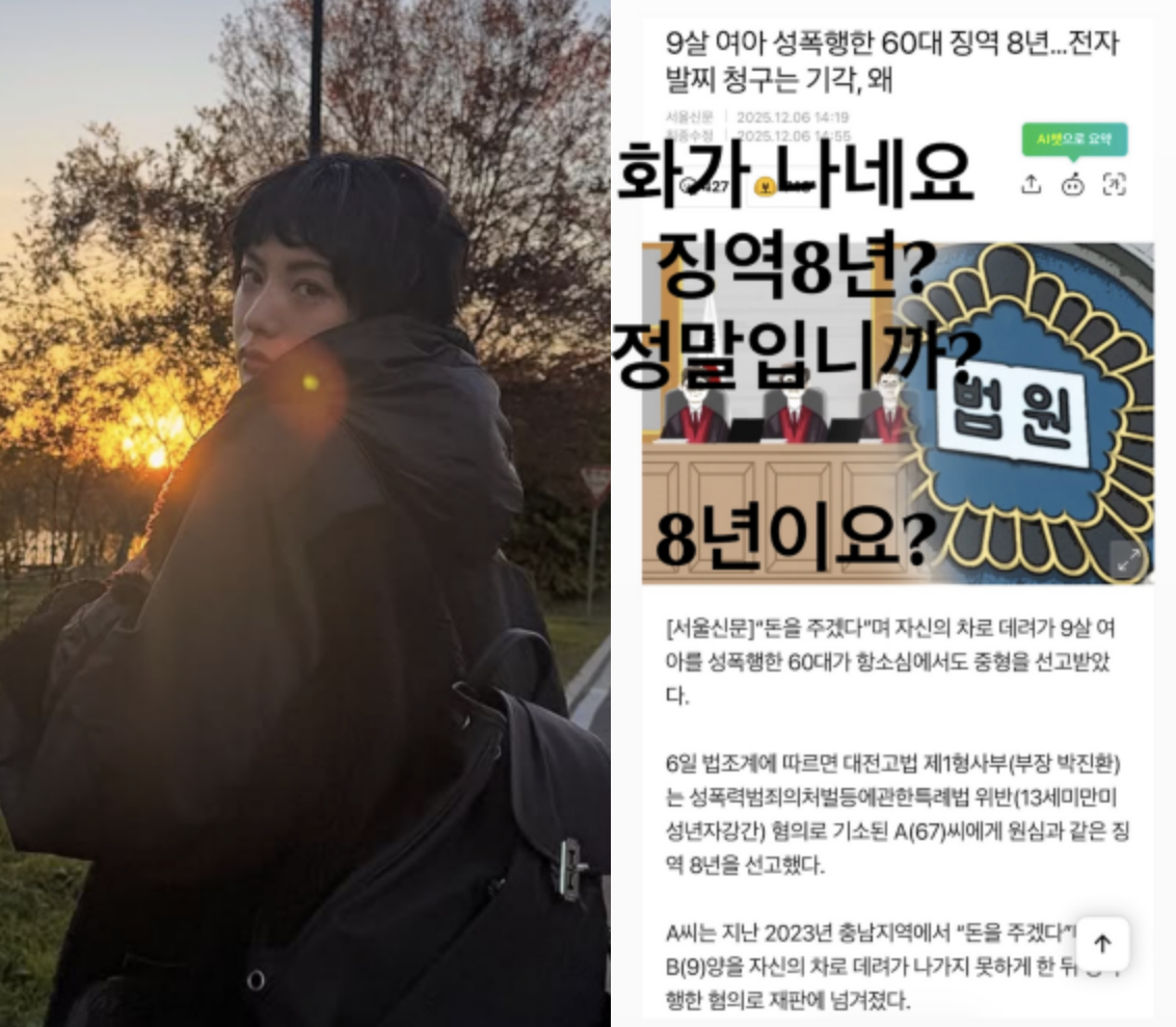 공개된 기사에는 9세 여아를 성폭행한 60대에게 징역 8년을 선고한 사건 내용이 담겼다. 나나는 해당 기사와 관련해 “징역 8년? 정말입니까. 8년이요?”라며 형량의 가벼움을 지적했다. 최근 나나가 직접 범죄 피해를 겪은 만큼 그의 발언은 더욱 주목을 받고 있다.