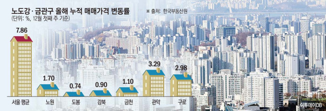 한국부동산원 통계에 따르면 올해 노원(1.70%), 도봉(0.74%), 강북(0.90%)의 누적 집값 상승률(12월 첫째 주 기준)은 서울 평균(7.86%)을 크게 밑도는 등 사실상 제자리걸음 수준이다. 금천(1.10%), 관악(3.29%), 구로(2.98%)도 서울 평균보다 오름폭이 작다. 누적 기준 올해 서울에서 가장 가파른 상승세를 보인 송파(19.38%), 성동(17.63%), 마포(13.28%) 등과 비교하면 이들 지역의 상승세는 더욱 미미하다.