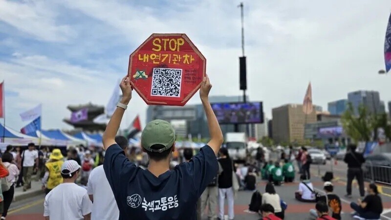 지난 9월27일 열린 ‘927 기후정의행진’에서 녹색교통운동의 한 활동가가 2035년 내연기관차 판매중단을 위한 서명 캠페인 손팻말을 들어 보이고 있다. 녹색교통운동 제공 |