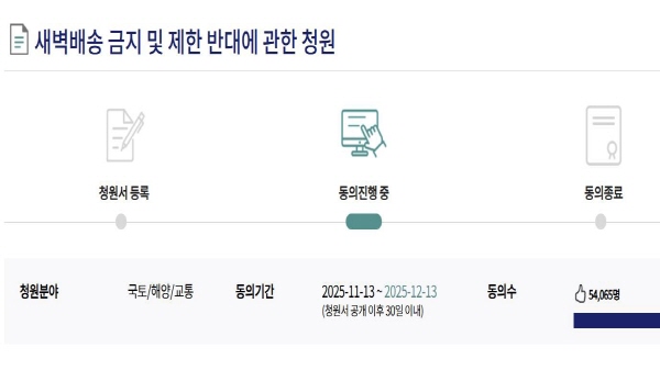 자신을 맞벌이 가정 주부라고 밝힌 한 청원인은 지난 달 13일 "저녁 늦게 귀가하는 맞벌이 부모에게 새벽 배송은 단순한 편의가 아니라, 일상을 지탱하는 중요한 수단"이라고 밝혔습니다.