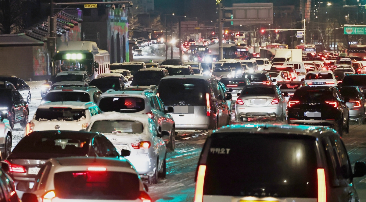 첫눈이 내린 지난 4일 오후 11쯤 서울 종로구 경복궁역 인근에서 시내로 향하는 차량이 정체를 빚고 있다. 연합뉴스