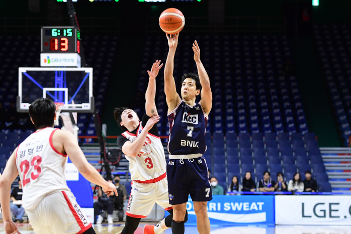 KCC는 7일 부산 사직체육관에서 벌어진 '2025~2026 LG전자 프로농구' 서울 SK와의 홈경기서 83대80으로 승리했다. 2연패 뒤 2연승에 성공한 KCC는 11승8패로 단독 3위로 올라섰다. 3연승에서 멈춘 SK는 10승9패로 5위로 내려갔다.