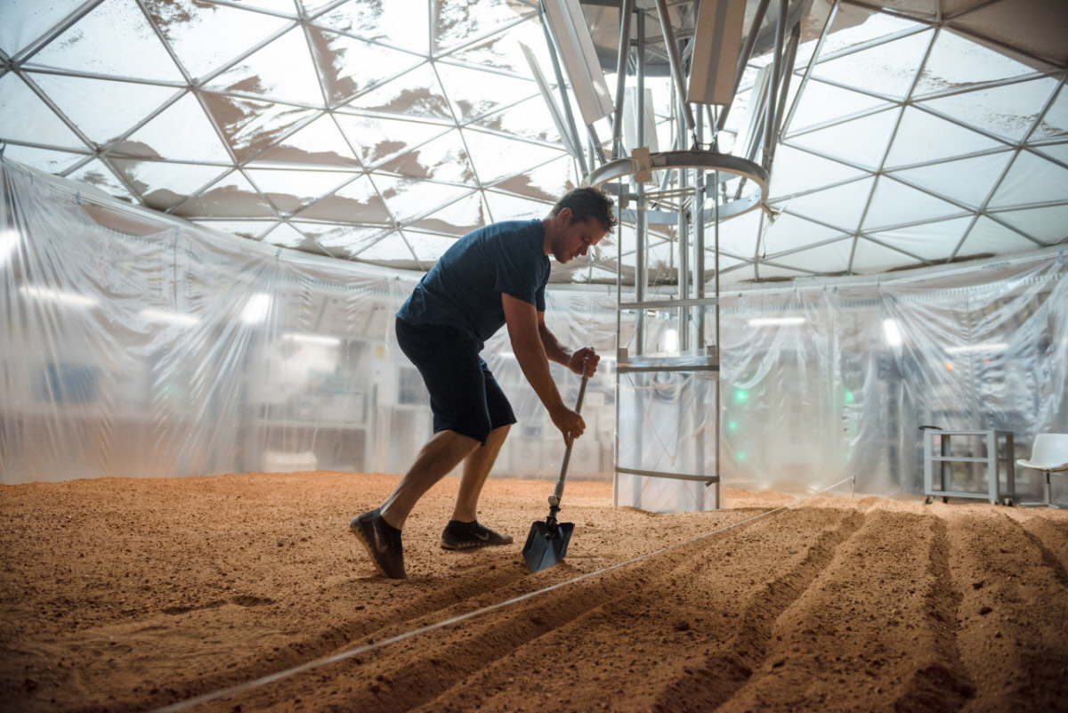 영화 <마션> 주인공 마크 와트니(맷 데이먼)가 화성 기지에서 감자밭을 일구고 있다. 온화한 온도와 습도 속에서 잘 자라던 감자는 기지 외벽이 파괴되면서 침투한 척박한 화성 환경 때문에 전부 죽고 만다. <마션> 영화의 한 장면. |