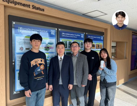 (왼쪽부터) KAIST 우성윤 박사과정, 김일두 교수, 이승섭 교수, 채지환 박사과정, A2US 소속 유지연 연구원 (상단) 조유장 박사. KAIST 제공 |