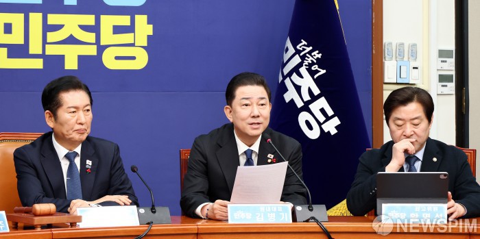[서울=뉴스핌] 정일구 기자 = 김병기 더불어민주당 원내대표가 8일 오전 서울 여의도 국회에서 열린 최고위원회의에서 모두발언을 하고 있다. 2025.12.08 mironj19@newspim.com