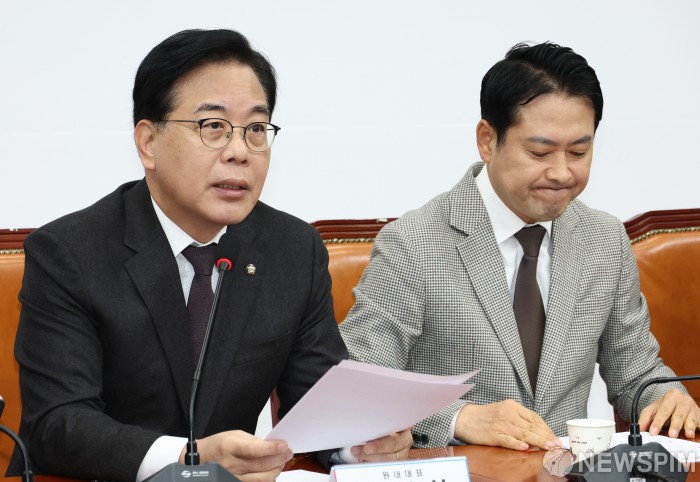 [서울=뉴스핌] 최지환 기자 = 송언석 국민의힘 원내대표가 8일 오전 서울 여의도 국회에서 열린 최고위원회의에서 발언하고 있다. 2025.12.08 choipix16@newspim.com