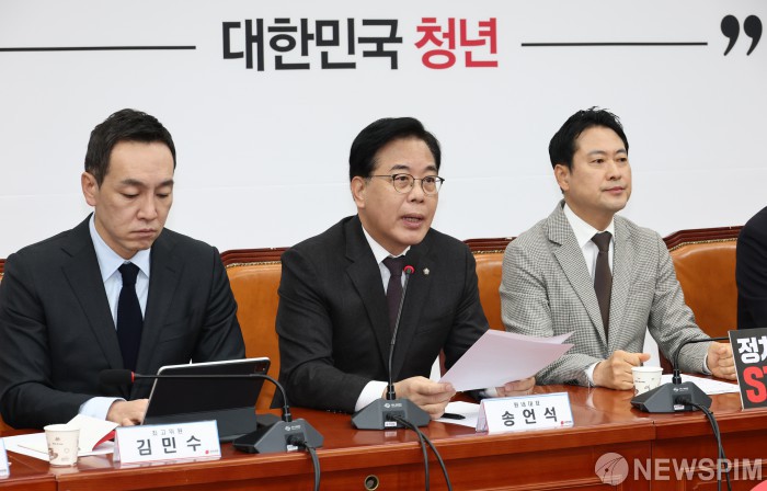 [서울=뉴스핌] 최지환 기자 = 송언석 국민의힘 원내대표가 8일 오전 서울 여의도 국회에서 열린 최고위원회의에서 발언하고 있다. 2025.12.08 choipix16@newspim.com |