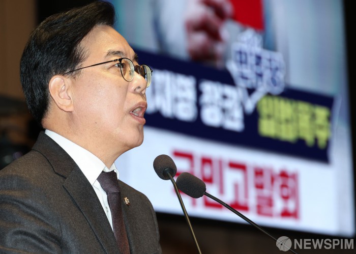 [서울=뉴스핌] 최지환 기자 = 송언석 국민의힘 원내대표가 8일 오전 서울 여의도 국회에서 열린 국민의힘 의원총회 및 이재명 정권 독재악법 국민고발회에서 발언하고 있다. 2025.12.08 choipix16@newspim.com
