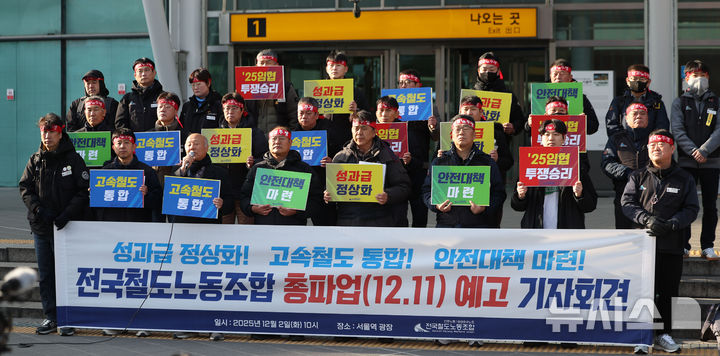 [서울=뉴시스] 김선웅 기자 = 전국철도노동조합 관계자들이 지난 2일 서울역에서 총파업(12.11) 예고 기자회견을 열고 고속철도(KTX-SRT) 통합, 안전대책 마련, 성과급 정상화 등을 촉구하고 있다. 2025.12.02. mangusta@newsis.com |