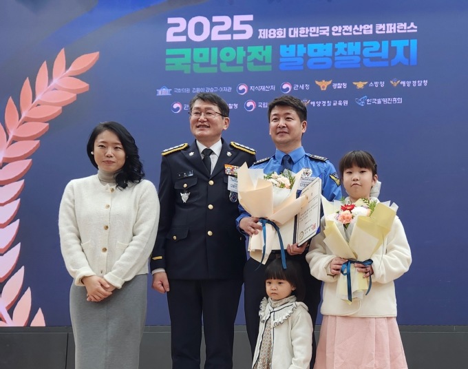 동해해양경찰서 삼척파출소 김정봉 경사가 개발한 '팽창형 드로우백'이 2025 국민안전 발명챌린지에서 우수 아이디어로 선정돼 동상을 수상했다. 김정봉 경사 가족들이 동상 수상을 축하하며 기념사진을 찍고 있다.[사진=동해해양경찰서] 2025.12.08 onemoregive@newspim.com |