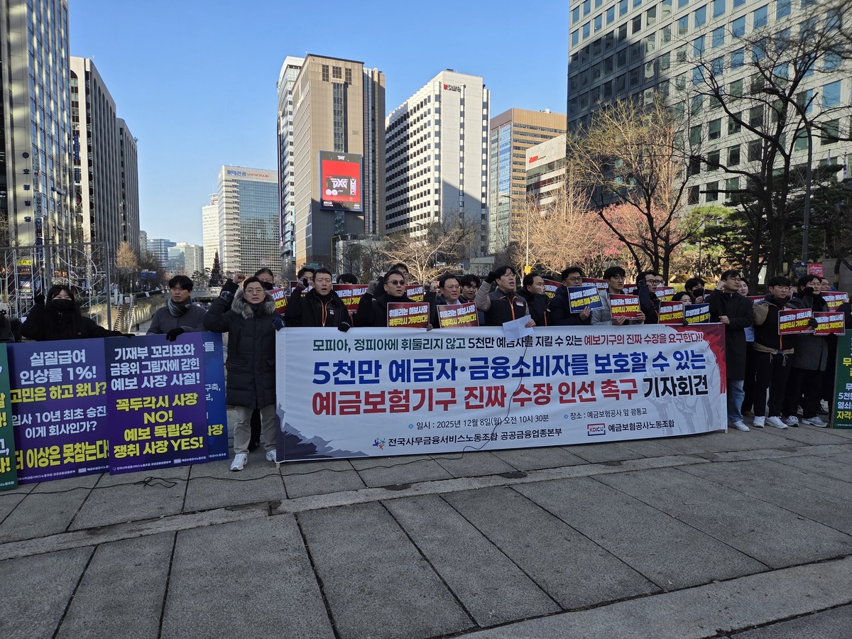 이날 전국사무금융서비스노동조합은 서울 중구 예보 사옥 앞에서 ‘예보 진짜 사장 선임 촉구 기자회견’을 열고 ‘낙하산 인사를 반대’한다며 목소리를 높였다. 김영헌 예보지부장은 “모피아·정피아(재정·금융 관료 및 정치권 인사를 마피아에 빗댄 말)에 휘둘리지 않고 5000만 예금자를 지킬 수 있는 예금보험공사(예보)의 진짜 수장을 요구한다”고 말했다.