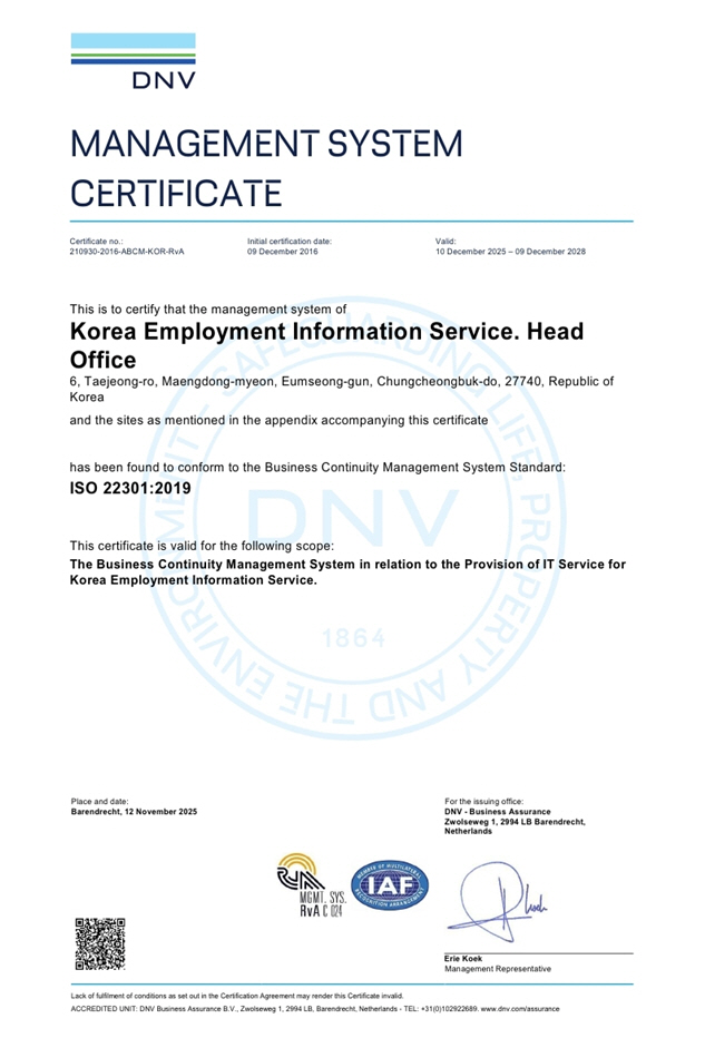 고용정보원 관계자는 "10년 연속 ISO 22301 인증 유지는 고용정보서비스의 연속성과 회복력이 국제기준에 부합한다는 의미"라며 "앞으로도 각종 재난과 장애 상황에서도 국민이 안정적으로 고용정보 서비스를 이용할 수 있도록 대응체계와 훈련을 지속 고도화하겠다"고 말했다.