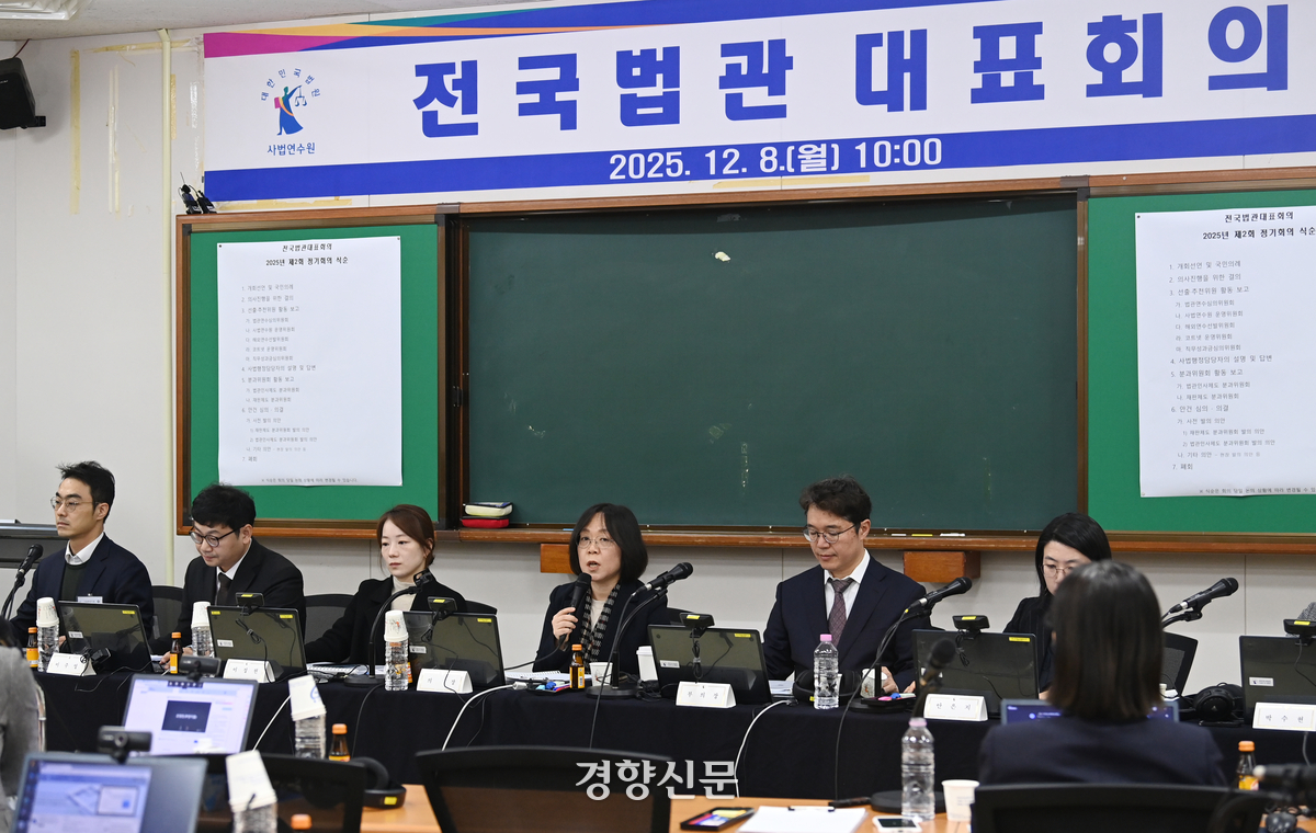 김예영(왼쪽 네번째) 전국법관대표회의 의장이 8일 경기 고양시 사법연수원에서 열린 전국법관대표 하반기 정기회의에서 발언하고 있다. 김창길 기자 |