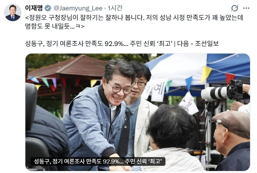 이 대통령은 이날 자신의 엑스에 “정원오 구청장님이 잘하기는 잘하나 봅니다”라며 “저의 성남 시정 만족도가 꽤 높았는데 명함도 못 내밀듯”이라고 적었다. 이 대통령은 그러면서 성동구가 주민들을 대상으로 한 구정 만족도 조사에서 92.9%의 만족도를 기록했다는 언론 보도를 함께 게시했다.