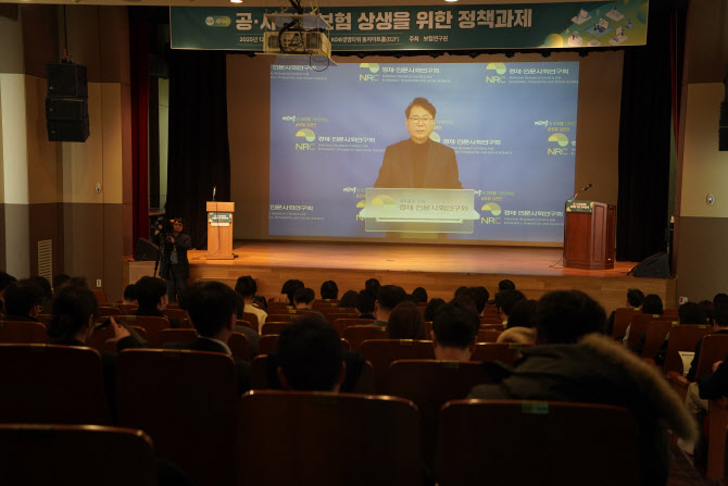 이한주 경제인문사회연구회 이사장이 8일 서울 용산구 KDB생명타워에서 보험연구원이 주최한 ‘공·사 건강보험 상생을 위한 정책과제’ 세미나에서 영상 축사를 하고 있다. 사진=보험연구원 제공 |