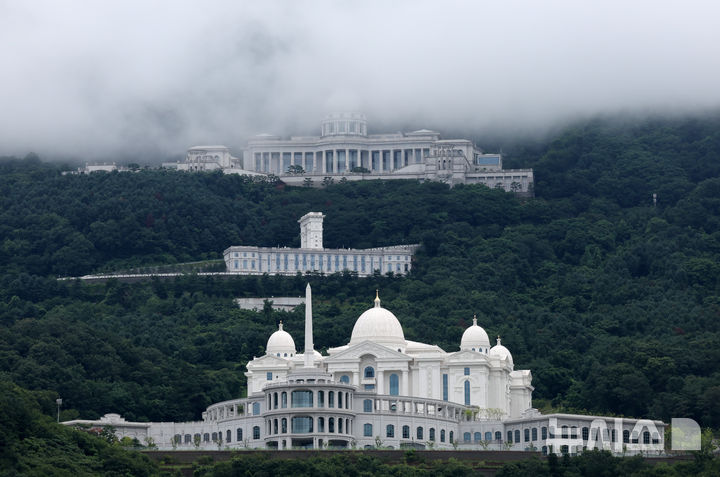 [가평=뉴시스] 배훈식 기자 = 김건희 여사 의혹을 수사하는 민중기 특별검사팀이 통일교 압수수색에 들어간 18일 오후 경기 가평군 통일교 천원궁(아래부터), 천승전, 천정궁박물관 모습. 2025.07.18. dahora83@newsis.com |