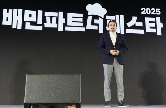 김범석 우아한형제들 대표가 8일 서울 서초구 aT센터에서 열린 '2025 배민파트너페스타'에서 발표하고 있다. 연합뉴스 |