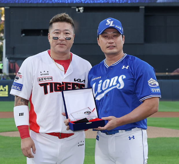 [서울=뉴스핌] 지난 9월 10일 광주에서 열린 오승환 은퇴 투어 경기에서 KIA의 최형우(왼쪽)와 오승환이 기념 촬영을 하고 있다. [사진 = 삼성] 2025.09.10 wcn05002@newspim.com |