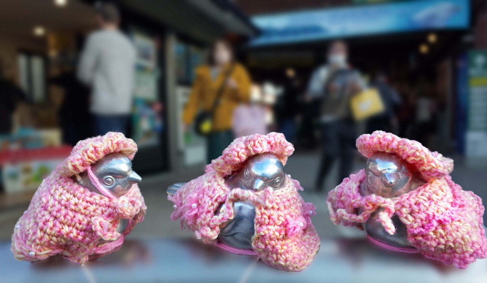 일본의 한 기차역. 출구 앞 참새 조형물이 따뜻한 뜨개옷을 입고 있습니다. 누군가의 작은 정성이 지나던 여행자의 발길을 잡습니다. 한주형 기자 |
