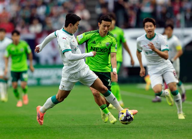 프로축구 K리그1 대전 하나시티즌의 유강현(왼쪽)이 지난달 8일 전북 전주월드컵경기장에서 열린 전북 현대와의 경기에서 김태환에 앞서 볼을 따내고 있다. 전주=뉴스1 |