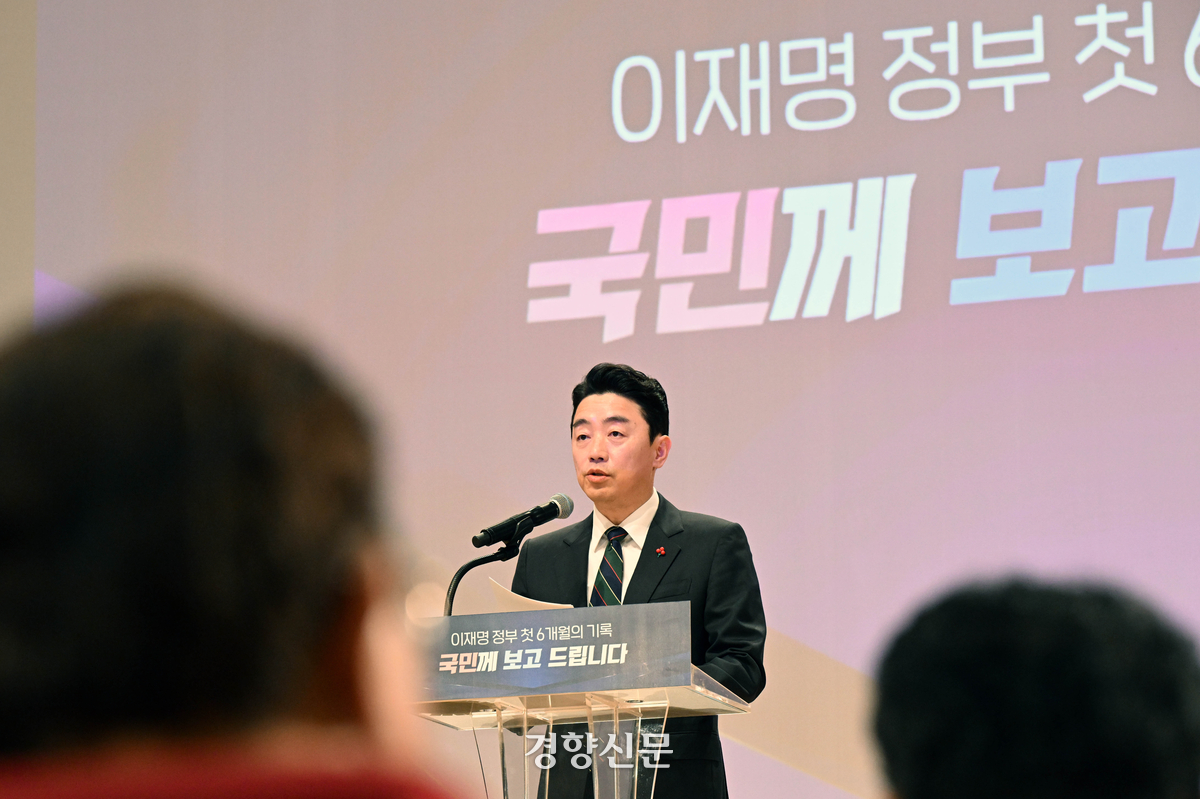 강훈식 대통령 비서실장이 지난 7일 용산 대통령실 대강당에서 열린 대통령실 6개월 성과 간담회에서 모두발언을 하고 있다. 대통령실사진기자단 |