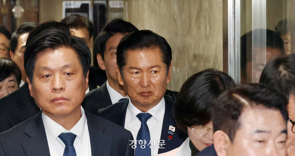 정청래 더불어민주당 대표가 8일 국회에서 열린 의원총회를 마치고 나서고 있다. 권도현 기자 |