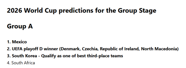 하지만 NBC는 다른 예상을 내놨다. 이 매체는 개최국 멕시코의 선전을 예상했다. 이 매체는 멕시코의 1위와 유럽 플레이오프에서 합류할 팀이 한국을 제칠 것이라 유력했다. 단 차이는 크게 보지 않았다. 이번 월드컵은 32개국이 아니라 48개국이기 때문에 3위 팀 중 상위권이 플레이오프에 합류한다.