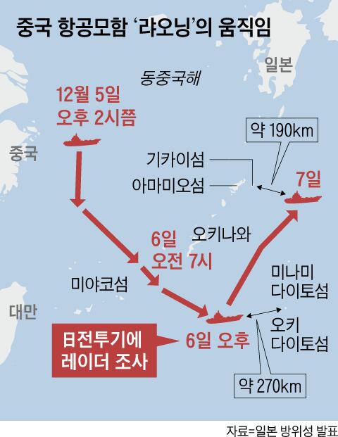 항모 랴오닝은 앞서 지난 6일 오키나와섬과 미야코섬 사이를 통과한 뒤 오키나와섬 남동쪽 해역에서 전투기를 발진했다. 중국 전투기가 일본 전투기를 레이더로 조준한 게 이 해역이었다.