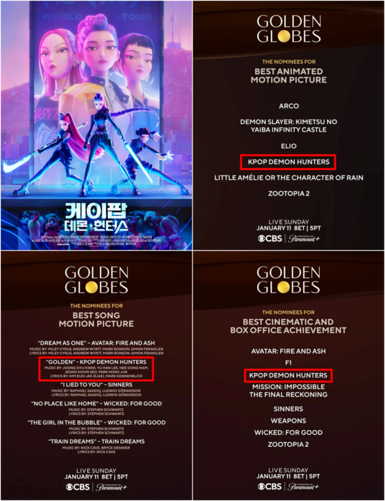 글로벌 콘텐트계 새 역사를 쓴 '케이팝 데몬 헌터스'가 골든글로브의 부름을 받았다.
